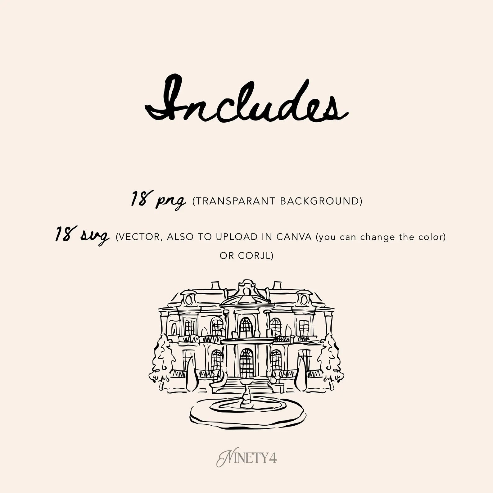 Whimsical Wedding Line Art Illustration (PNG, SVG)